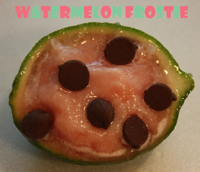 \Instructions: Blend the ingredients. I then scoop out as much of the innards of the lime, topped with chocolate chips for seeds, and placed these in the freezer until I served.