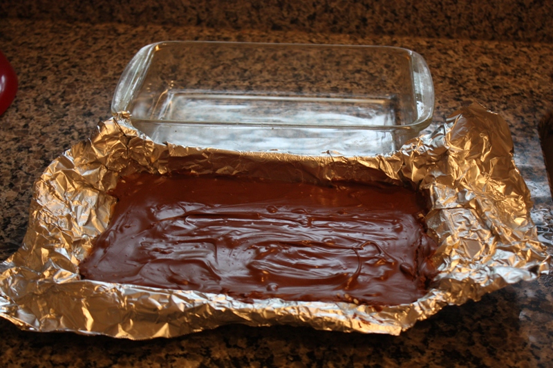 I put it in the fridge for about 45 minutes to speed the chocolates hardening, and then I pulled the entire dish out without any problem (much easier to cut this way).